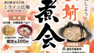 イベント 「もへ!さかた!駅前芋煮会2025」開催🍁 ~秋の味覚をふんだんに~ 山形の名物イベント「芋煮会」を、酒田駅前で楽しめる、「もへ!さかた!駅前芋煮会2025」を開催いたします 【庄内風】1杯600円【内陸風】1杯700円大鍋で作る料理って、おいしいですよねぜひ食べ比べでご賞味ください... 2025.09.22 イベント